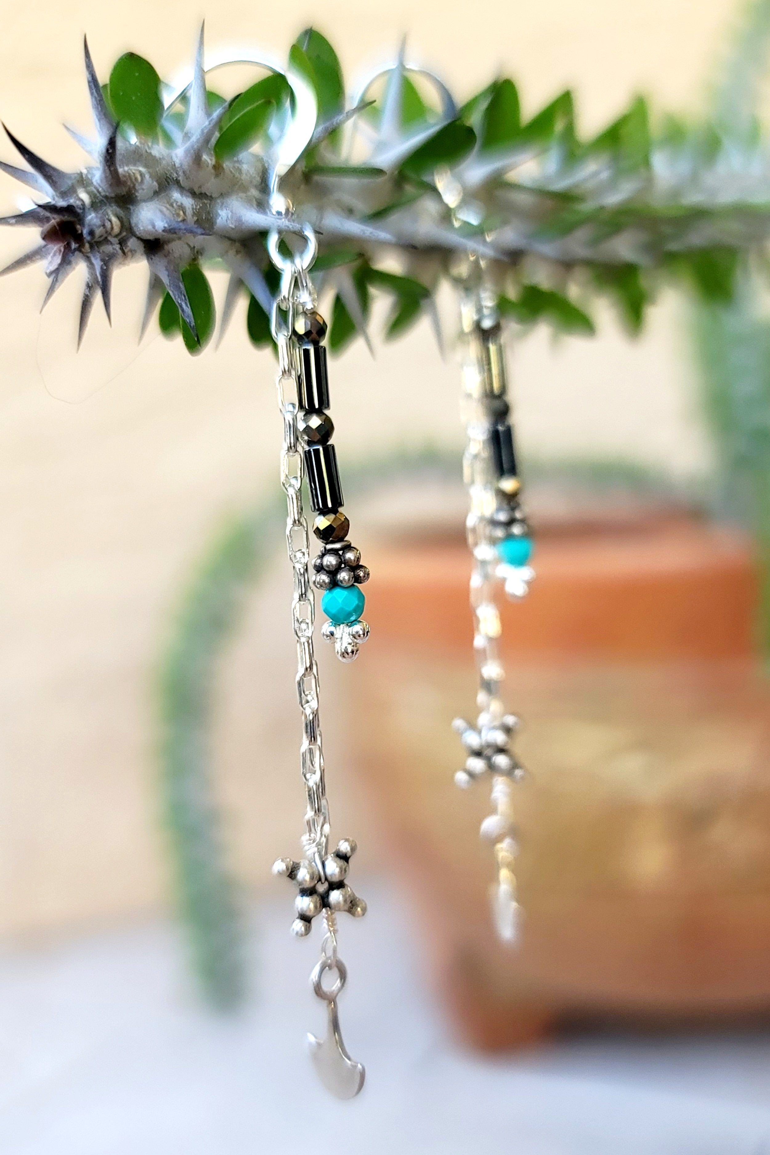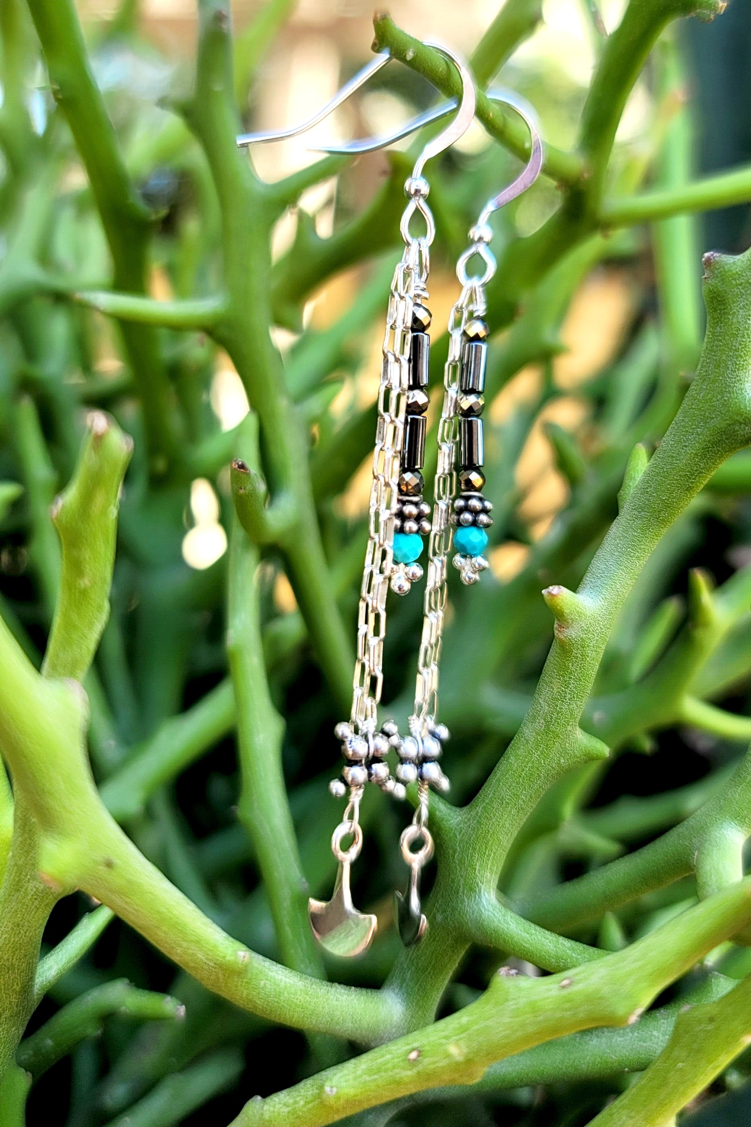 An edgy yet glamourous pair of western-style earrings. 100% sterling silver with hematite, pyrite, and turquoise accents.