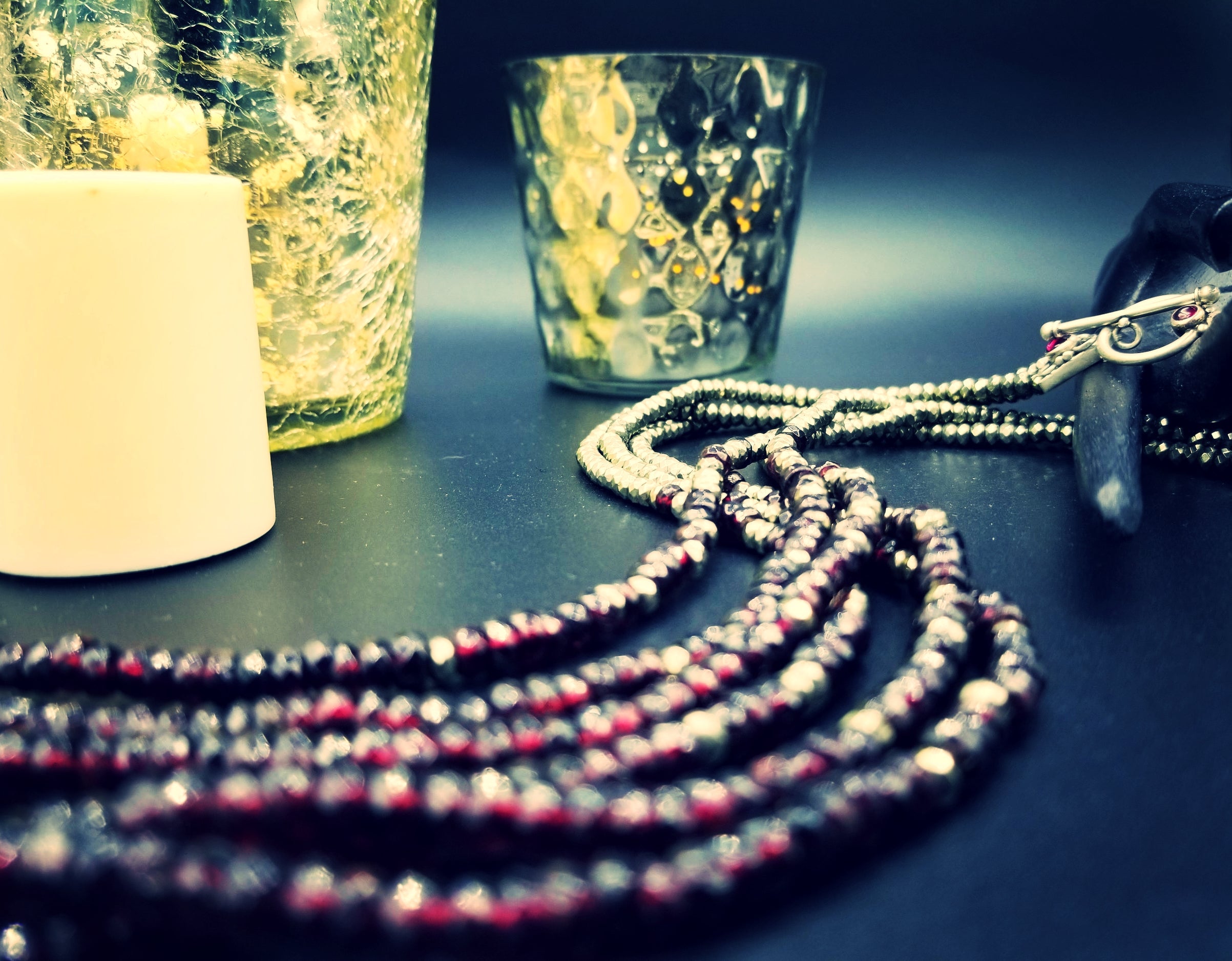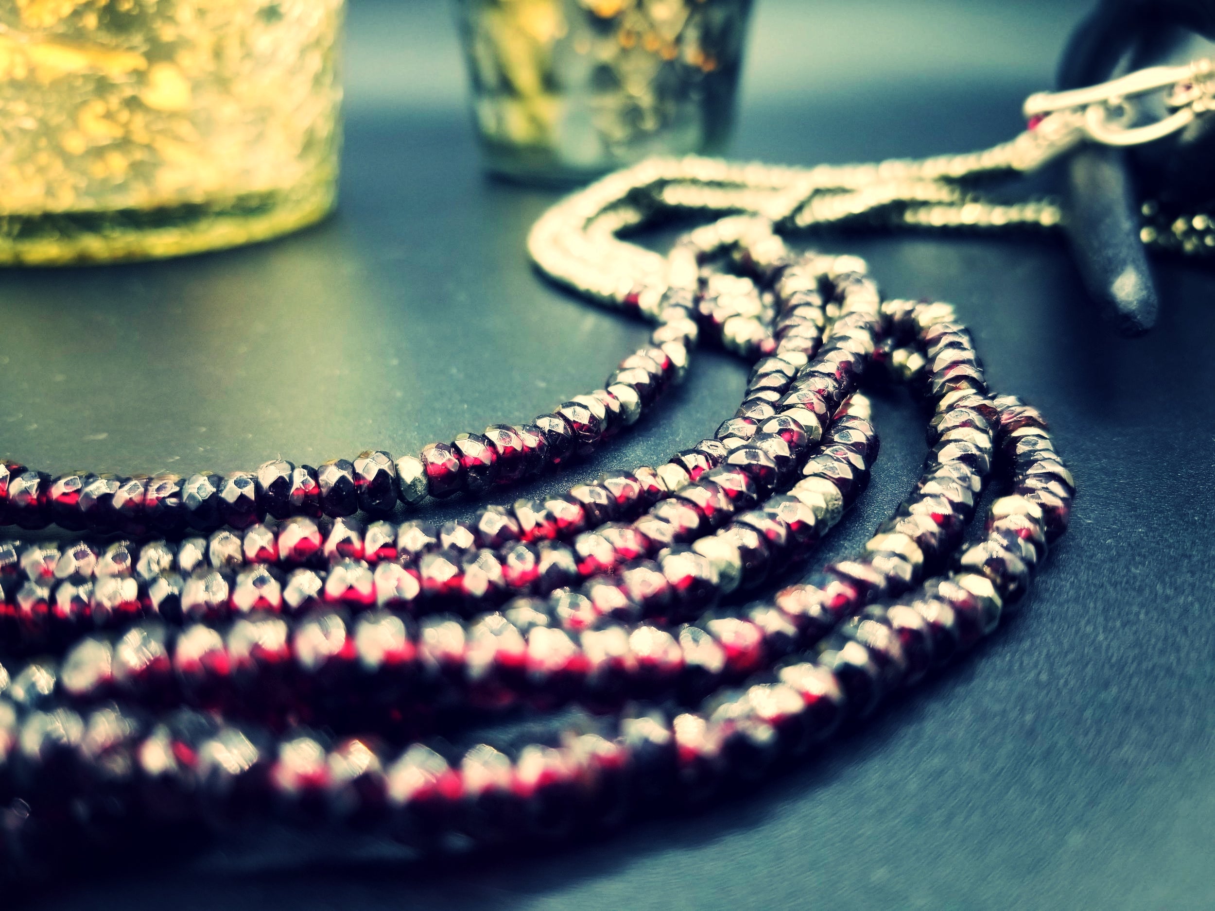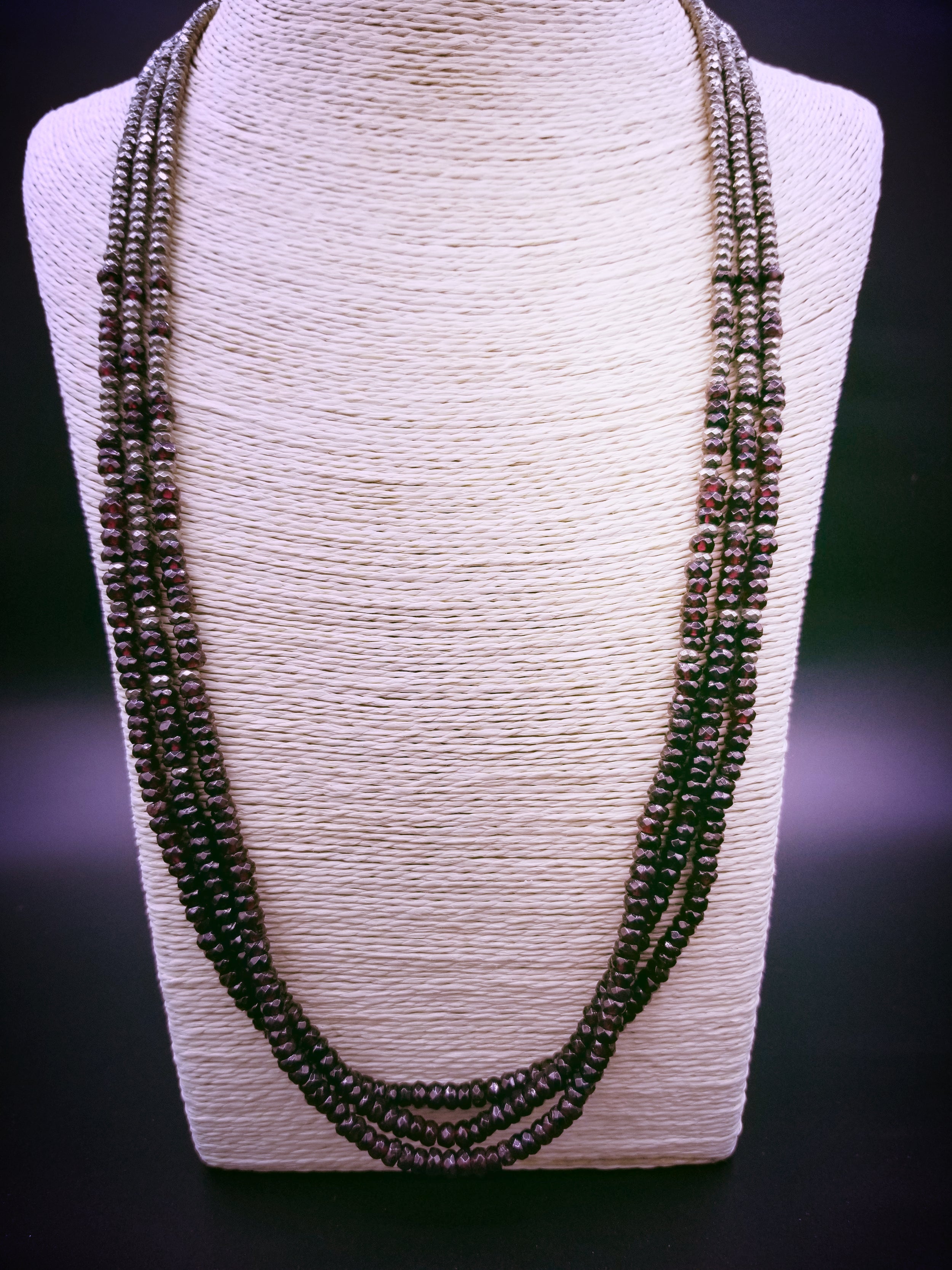 Elegant three strand necklace made of faceted pyrite and garnet. Finished with a sterling silver and garnet clasp.