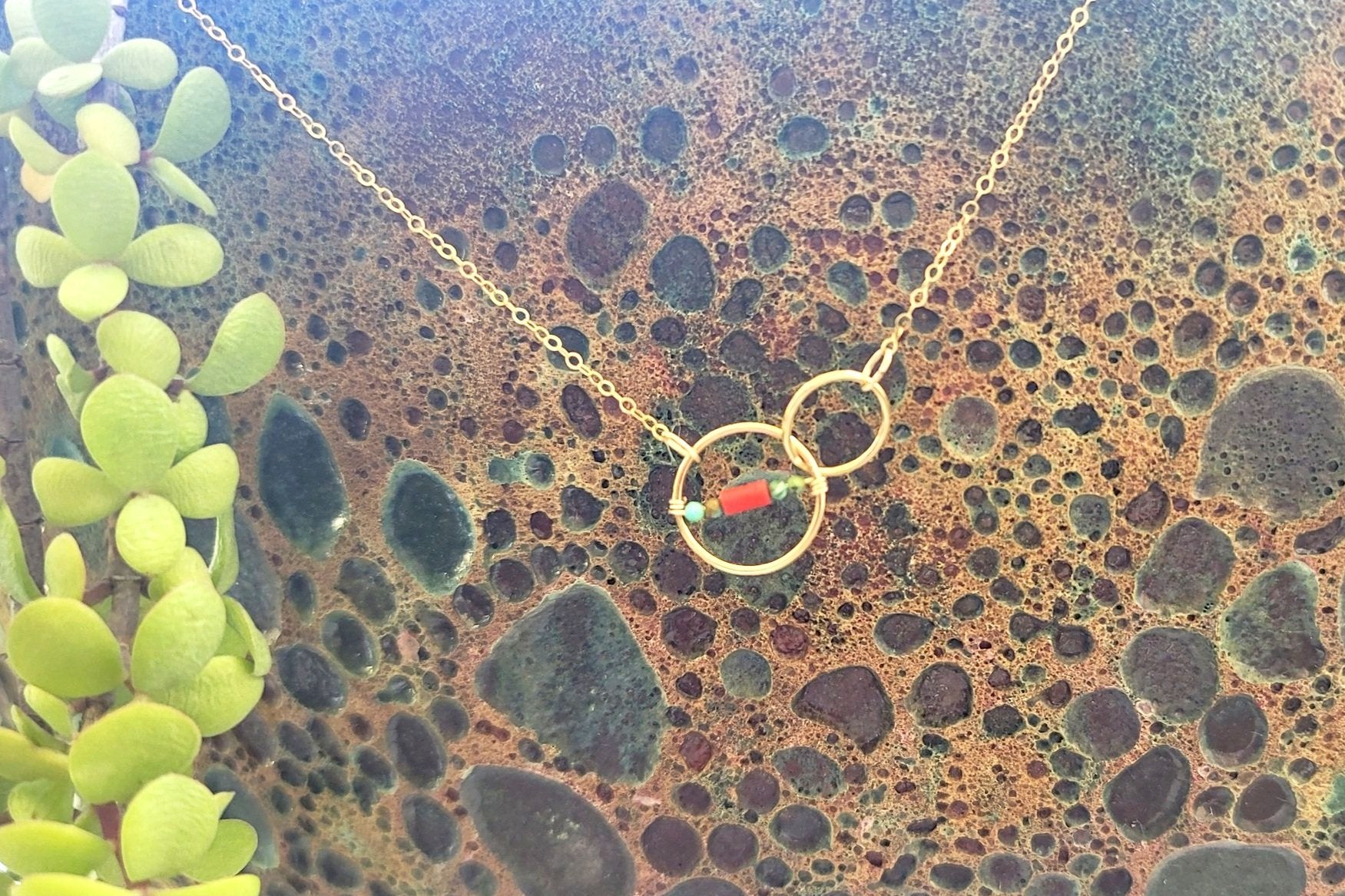 A modern take on southwest style. Center your swirling energy with this delicate gold necklace. Two concentric graduated circles hold a string of gems from the earth and sea - turquoise from Nevada and red coral.